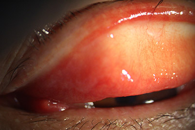 이 질환에 걸리면 눈동자의 하얀 부분이 밝은 분홍색에서 불그스름하게 보이며 눈꺼풀은 부어오르거나 처져 있게 되기도 합니다. 감염되게 되면 눈에서 액체가 나와서 속눈썹과 눈꺼풀에 딱지를 촉발합니다. 그 결과 눈을 뜨기 힘들게 하였거나 잤다가 일어나면 눈곱이 수시로 생겨나게 해요.