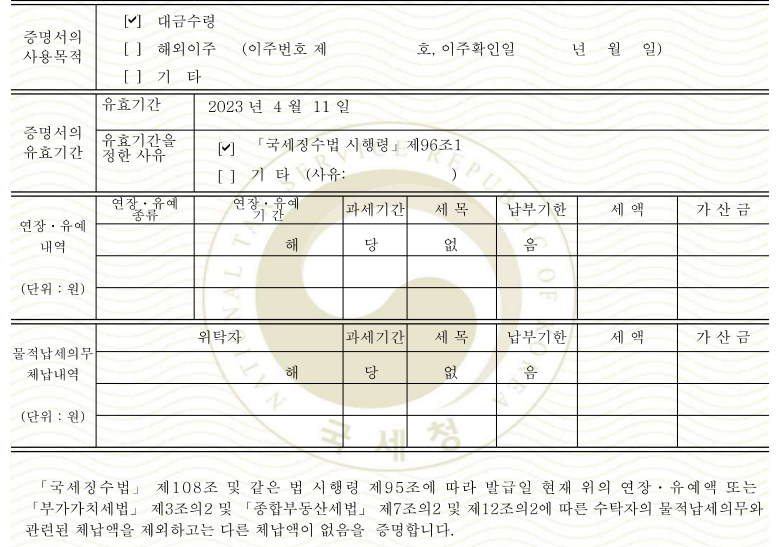이러한 방식으로 납세증명서는 체납 세금 유무를 증명해주는 민원 문서이고요. 따라서 세금을 얼마나 냈는지를 증명하는 것이 아니라 징수유예액이나 체납처분 유예액을 제외한 체납액이 없음을 증명하는 문서라고 할 수 있다고 합니다.