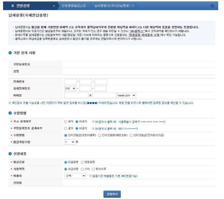 4. 국세 납세증명서(완납증명서) 인터넷 발급하기