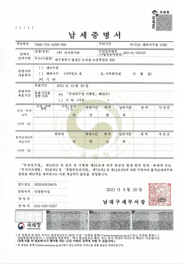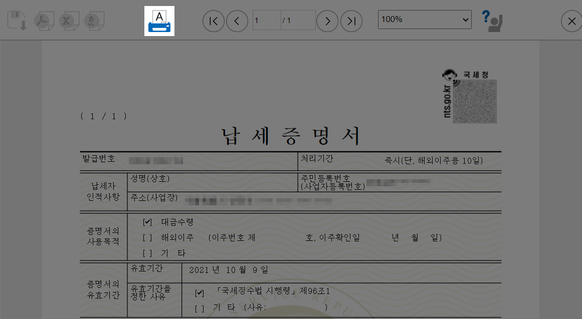 따라서 완납증명서를 제출하더라도 발급일을 기준으로 세금 체납이 없음을 증명하므로, 증명서에 등재된 기간만큼만 유효한 서류이고요. 보통 약 30일의 유효기간이 주어지는데, 해당 문서를 통해 세금 납부의 성실성을 포착하고 내어줄 수 있는지를 어림잡기 때문이고요.