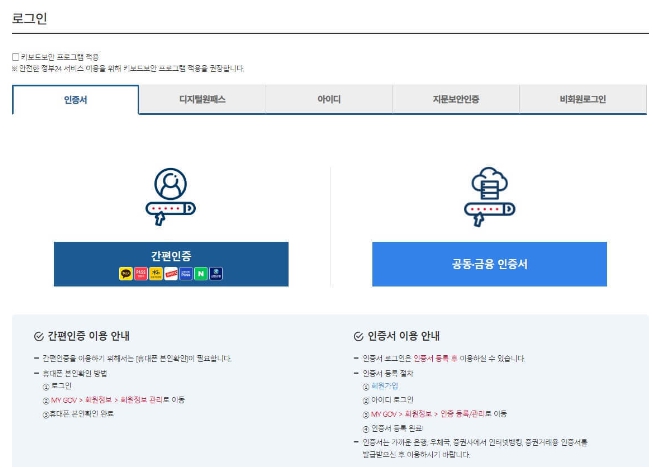 정부 24 역시 로그인할 때 인증서, 간편 인증 등을 사용할 수 있고요.