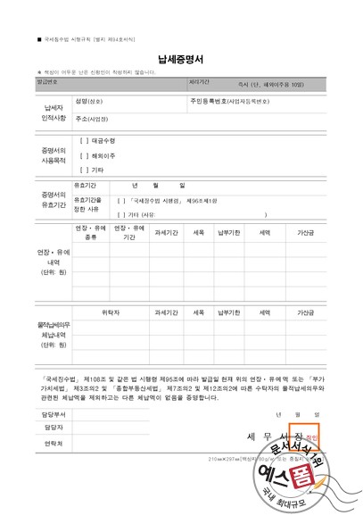 국세 납세증명서는 예사로 은행업무를 볼 때 필요로 하는 양식으로 국세 완납증명서를 제출함으로써 개인 또는 법인의 국세 납부 현황을 알아볼 수 있으니까 이와 관련한 업무를 정확하게 진척할 수 있다고 합니다.