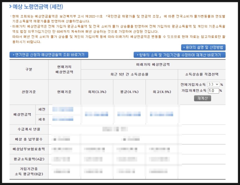 그리고 검정색으로 박스를 친 부분은 본인이 직접 소득상승률을 선택하여 국민연금 수령액을 확인할 수 있고요.
