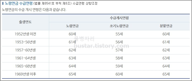 *국민연금 출생연도별 수령 나이~1952년생 : 60세1953~1956년생: 61세1957~1950년생: 62세1961~1964년생: 63세1965~1968년생: 64세1969~:65세위와 나란히 정리되기도 합니다. 물론 조기노령연금이기 때문에 미리 받을 수 있는데최대 5년 일찍 수급 가능하시고, 1년마다 6%씩 최대 30% 감액된 액수를 지급받으실 수 있다고 합니다.정 급한 경향이 혹은 물가상승률 고려하더라도 저 정도 수치는 멸시할만한 수치는 아니라고 생각이 되네요 ㅎㅎ