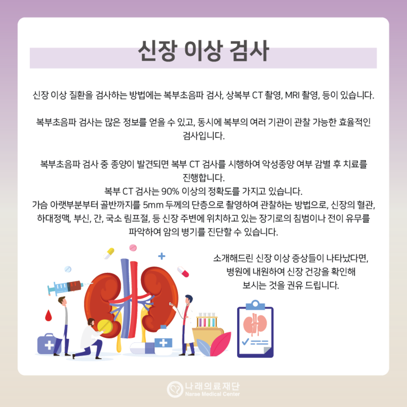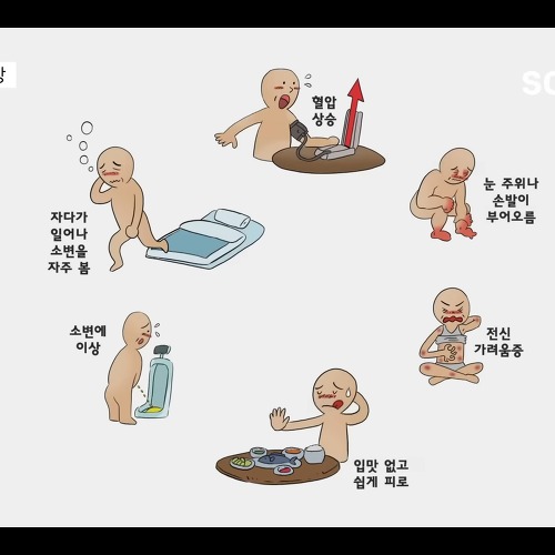 생각할 겨를 없이 소변양이 많아지거나 소변 보는 빈도가 급작스레 불어나는 경우도 신장이 안좋으면 나타나는 증상 중 한 종류인고 하는데요. 밤에 잠을 자다가도 소변 신호가 와서 잠에서 깨는 경우가 빈번히 발생하게되면 검사를 받아보는것이 좋다고해요.