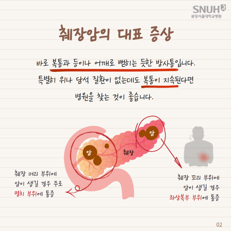 황달에 이어 췌장암의 최고 귀중한 증상은 통증으로 볼 수 있고요. 복부 통증은 가끔가다 잘 나타나는 통증이라 외면하는 경우가 넉넉한데요. 복부 중 명치 부분의 통증이 제일 비일비재하지만, 복부 어떤 부분이든 통증이 올 수 있고요. 췌장은 등과 가까워 허리 통증도 호소하는 경향이 있으나, 요통의 경우 암이 예상보다 많이 전이가 되었을 경우가 많다고 하고요.