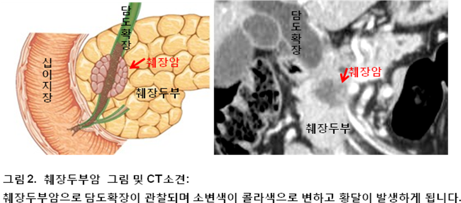 췌장에 종양이 일으켜서 뒤따르는 부분이 막혀 담즙이 똑바로 흐르지 못하게 되어서 황달 증상이 띄게 된다 하였습니다. 황달이 생기면 진한 갈색 또는 붉은색의 소변을 보게 되기도 합니다. 대변 역시 흰색이나 회색 등을 띠고, 피부 가려움증의 증상이 있다고 합니다.