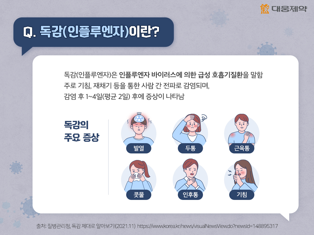 독감은 겨울철에 주로 유행하며, 감기에 비해 증상이 더 심각한 질환입니다. 독감의 증상은 개인에 따라 차이가 있을 수 있지만, 대체로 발열, 기침, 인후통, 근육통 등의 전형적인 증상을 보입니다.